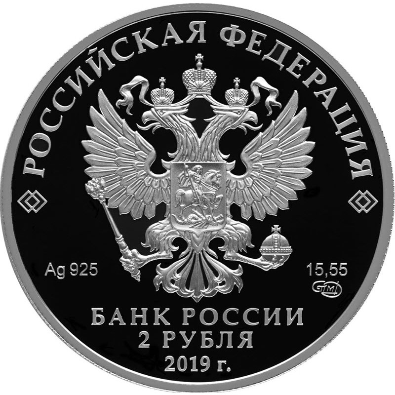 На аверсе в центре — рельефное изображение Государственного герба Российской Федерации, вверху вдоль канта надпись: РОССИЙСКАЯ ФЕДЕРАЦИЯ, обрамленная с обеих сторон сдвоенными ромбами, внизу под гербом надпись: Ag 925 15,55 СПМД (вес и проба серебра, монограмма монетного двора), ниже надпись в три строки: БАНК РОССИИ 2 РУБЛЯ 2019 г. (банк, номинал, год чеканки).
