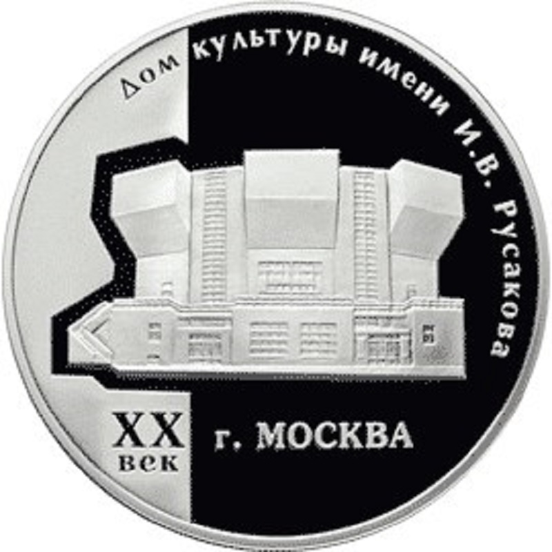 изображение здания клуба, под ним слева в две строки – дата «XХ век», справа – надпись: «г. МОСКВА», вверху по окружности – надпись: «ДОМ КУЛЬТУРЫ ИМЕНИ И.В. РУСАКОВА».