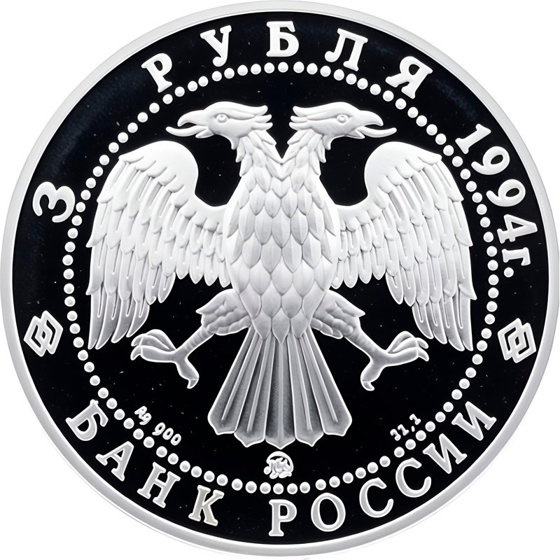 Рельефное изображение эмблемы Банка России.  Над ней вдоль канта надпись: 3 РУБЛЯ 1994 г. (номинал, год чеканки). Внизу надпись: БАНК РОССИИ. Слева надпись: Ag 900 (проба серебра), справа: 31,1 (вес серебра), между ними - ММД (монограмма монетного двора).