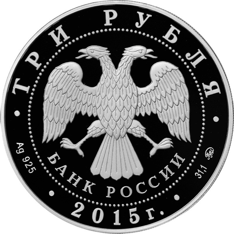 В центре — эмблема Банка России. Надписи по кругу — вверху: ТРИ РУБЛЯ (номинал), внизу: слева — Ag 925 (проба серебра), в центре — 2015 г. (год чеканки), справа — 31,1 ММД (вес серебра и монограмма монетного двора).