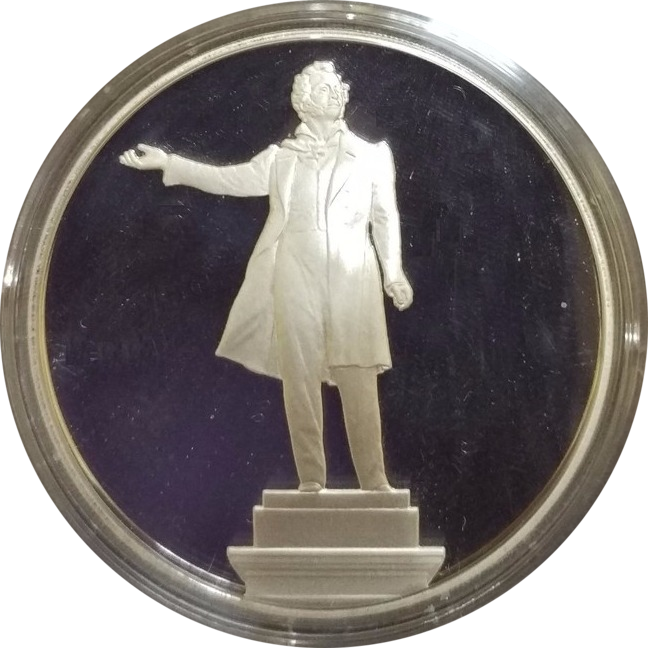 Серебряный жетон России «Памятник А. С. Пушкину в Санкт-Петербурге». Жетон отчеканен Санкт-Петербургским монетным двором в честь 300-летия города.