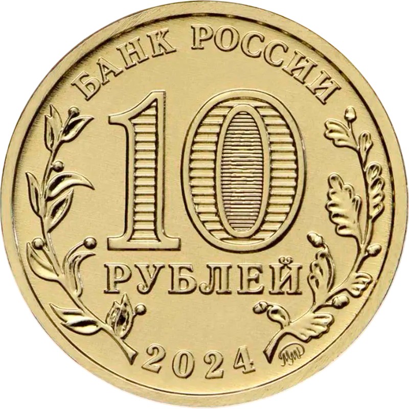 По окружности расположены надписи: вверху — БАНК РОССИИ, внизу — 2024 (год чеканки) и ММД (монограмма Московского монетного двора). Слева и справа расположены изображения ветвей лавра и дуба соответственно. В центре надпись - 10 РУБЛЕЙ (номинал). Внутри цифры 0 имеется защитный элемент в виде числа «10» и надписи «РУБ», наблюдаемых под разными углами зрения к плоскости монеты.
