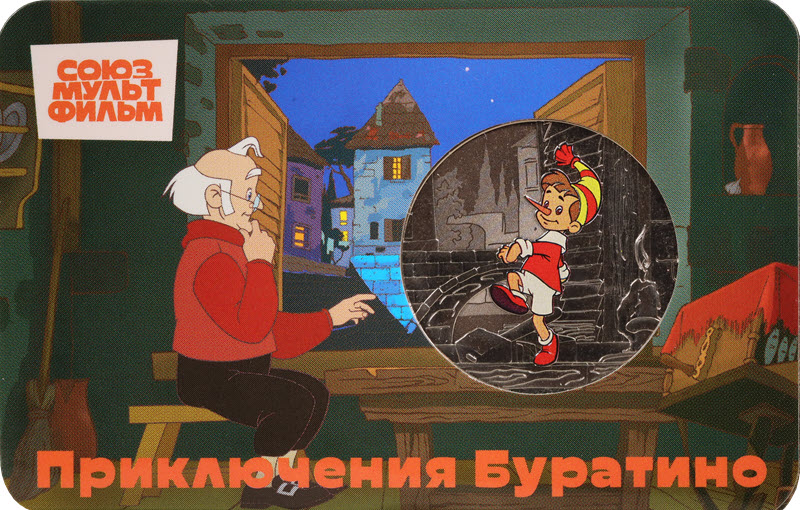 Российский медно-никелевый жетон 2025 года от ММД Гознак из серии «Мультфильмы нашего детства» посвящена мультфильму «Приключения Буратино». У него качество анциркулейтед и селективная окраска. Поставляется в блистере. Тираж: 7000 штук.