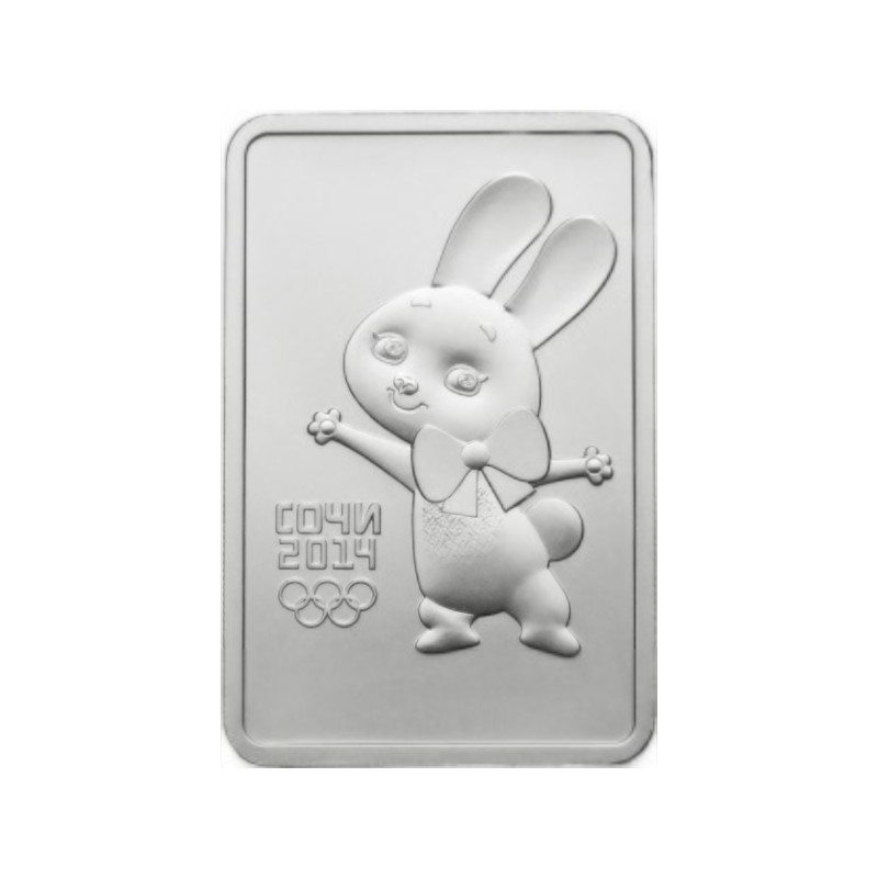 Реверс: рельефное изображение Зайки - официального талисмана XXII Олимпийских зимних игр 2014 года в городе Сочи, внизу слева в две строки – надпись: "СОЧИ" и дата: "2014", под ними – пять олимпийских колец.