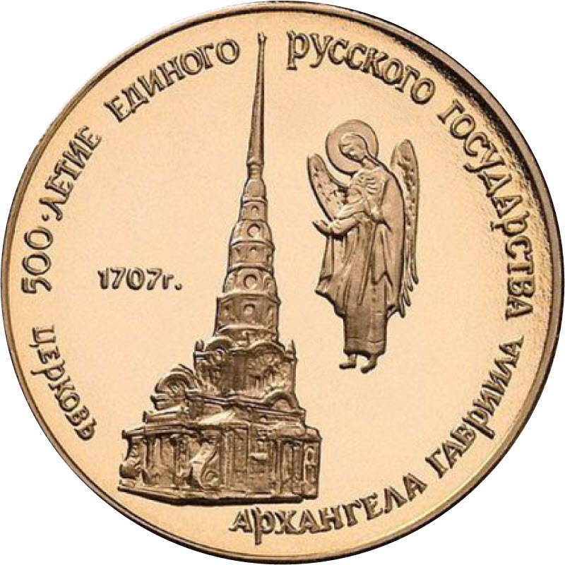 Золотая монета из серии "500-летие единого Русского государства" - Церковь архангела Гавриила.