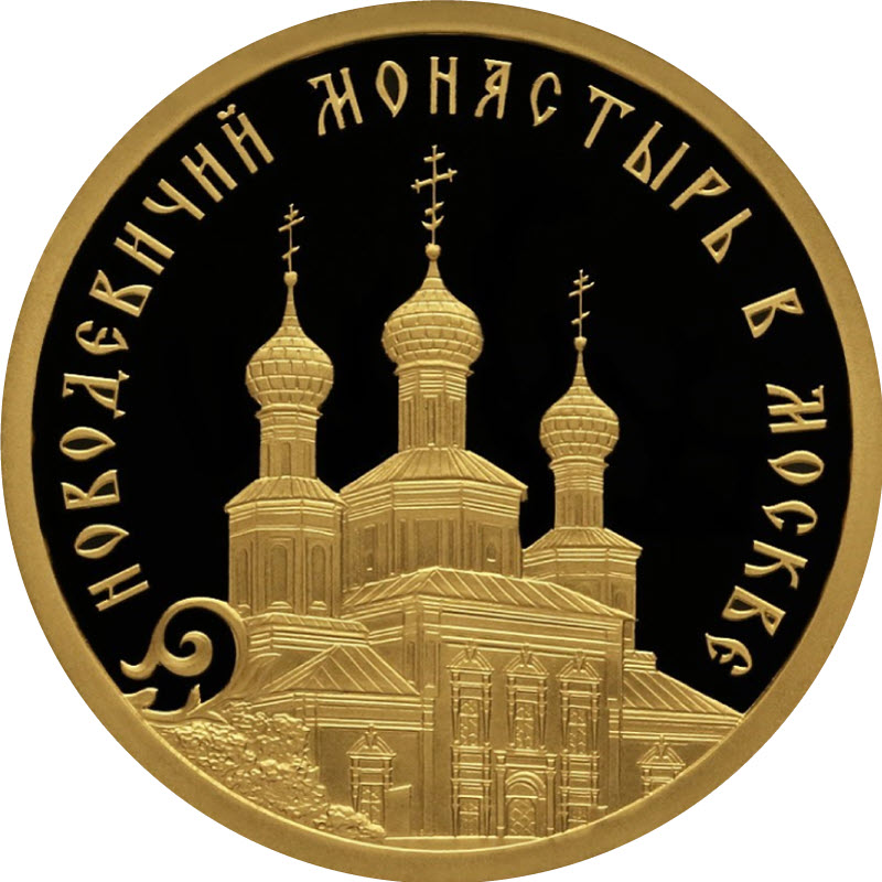 на зеркальном поле диска – рельефное изображение Покровской надвратной церкви, слева – элемент растительного орнамента, вдоль канта – надпись: "НОВОДЕВИЧИЙ МОНАСТЫРЬ В МОСКВЕ".
