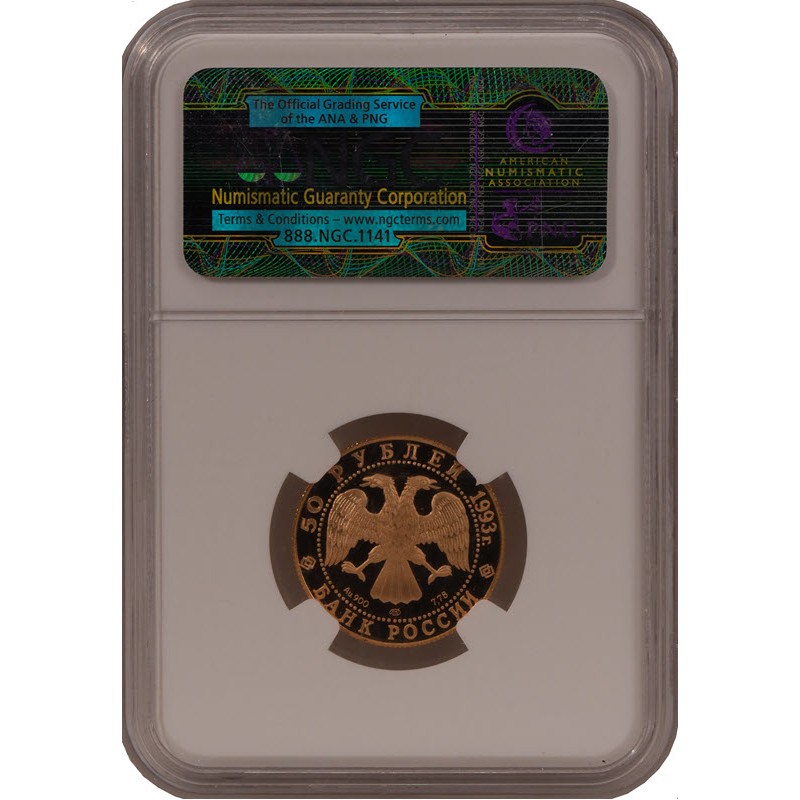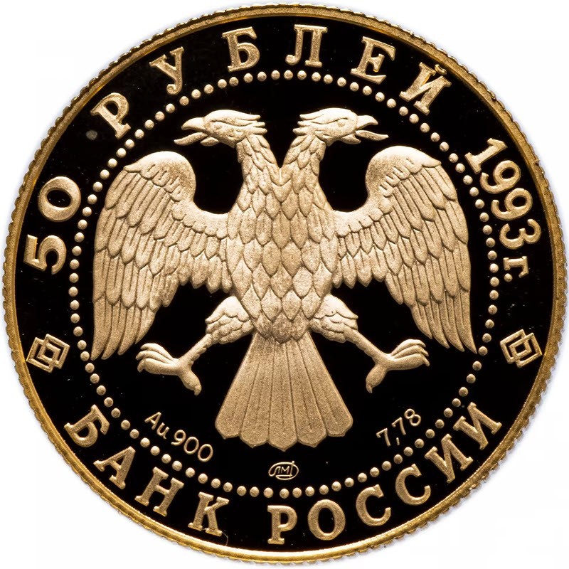На аверсе изображен герб Банка России (двуглавый орел с опущенными крыльями). Под ним надпись: Au 900 ЛМД 7,78 (вес и проба золота, монограмма Ленинградского монетного двора). Вверху вдоль канта надпись: 50 РУБЛЕЙ 1993 г. (номинал, год чеканки), внизу: БАНК РОССИИ.