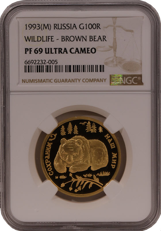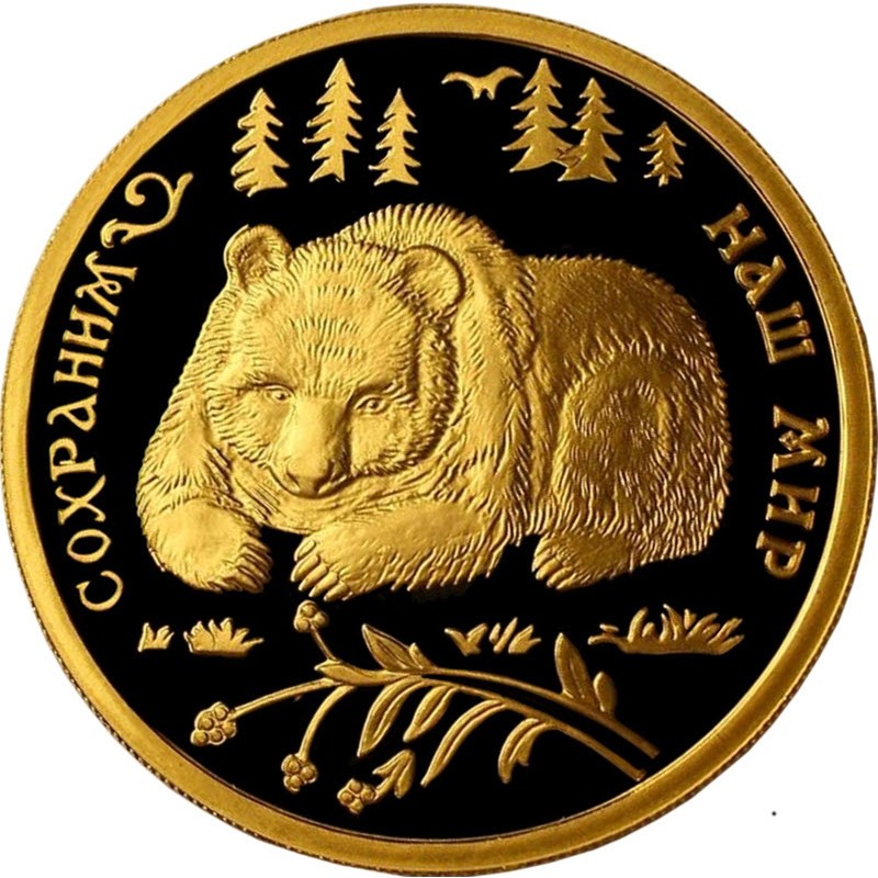 Золотая монета Банка России 1993 года из серии «Сохраним наш мир» посвящена бурому медведю. У нее качество пруф. Тираж: 1400 штук.