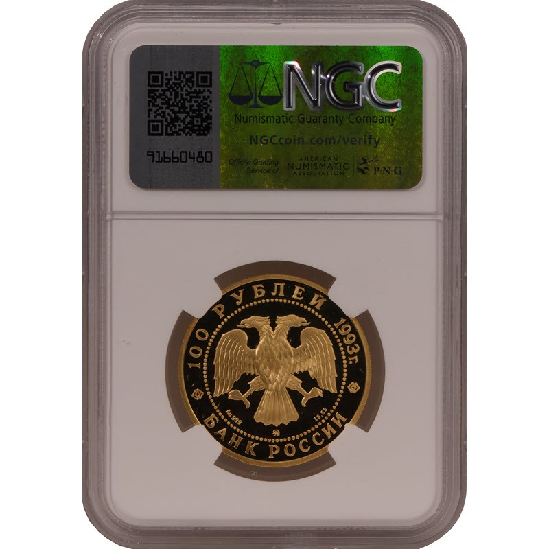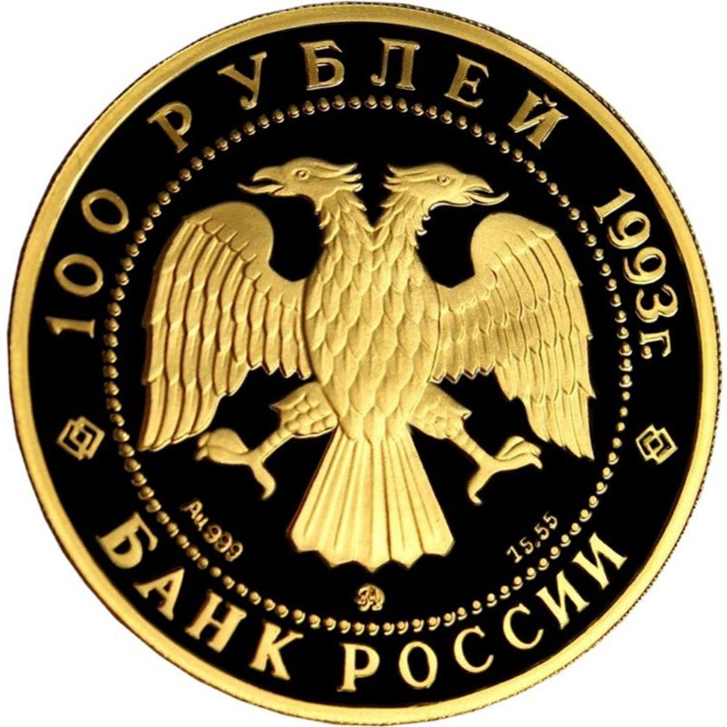 На аверсе изображен герб Банка России (двуглавый орел с опущенными крыльями). Под ним надпись: Au 999 ММД 15,55 (вес и проба золота, монограмма Московского монетного двора). Вверху вдоль канта надпись: 100 РУБЛЕЙ 1993 г. (номинал, год чеканки), внизу: БАНК РОССИИ.